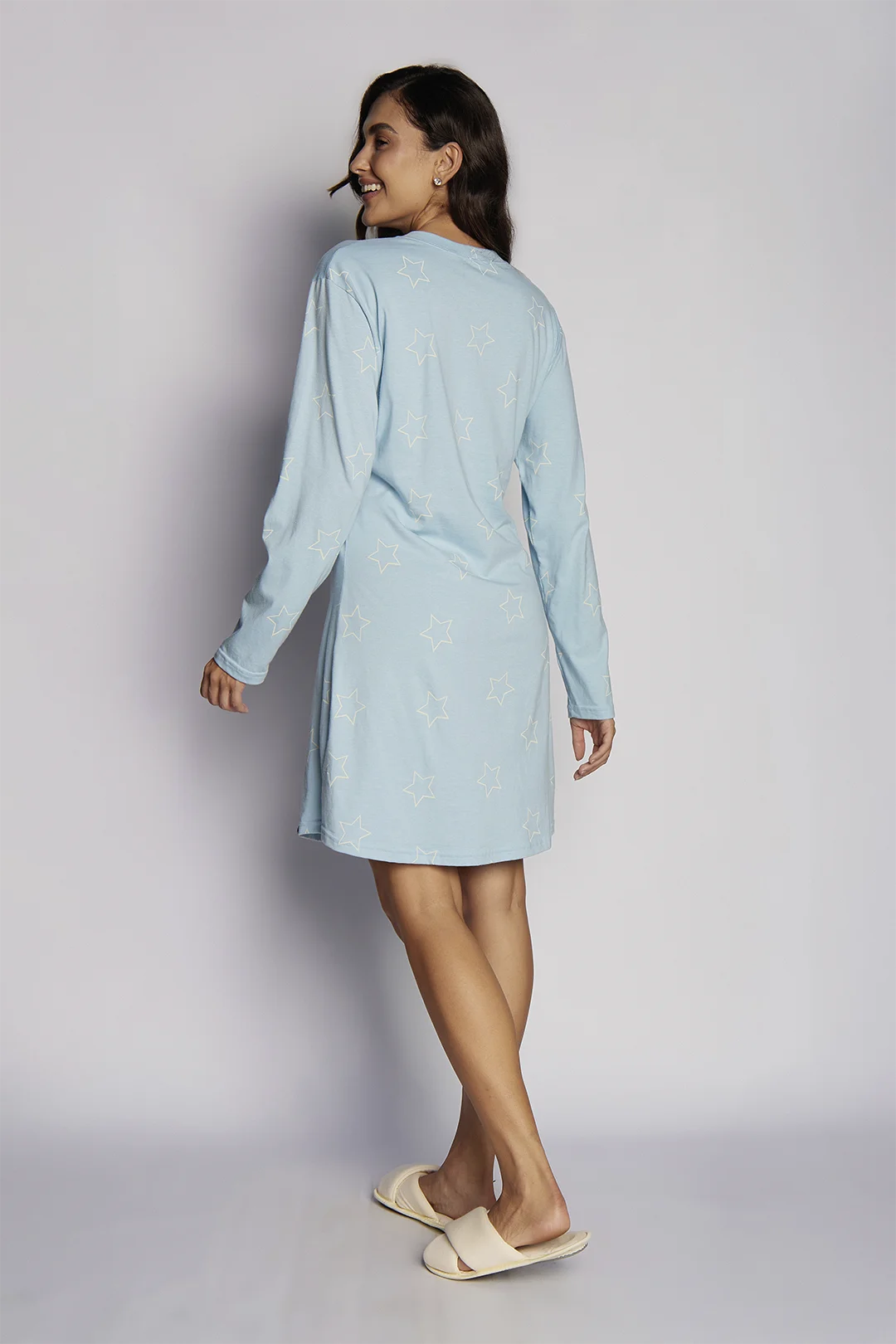 Camisola feminina estampada confortável em algodão, leve e macia. Azul bebê com estrelas delicadas para noites tranquilas e momentos de puro aconchego.