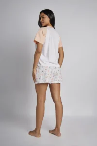 Este conjunto foi pensado para unir conforto e praticidade no mesmo visual. A camiseta branca ganha detalhes delicados na gola e nas mangas em tom de rosa claro, trazendo um charme sutil e feminino. O shorts em branco com estampa leve complementa o look com equilíbrio, mantendo a proposta suave e descomplicada — perfeita para quem deseja relaxar sem abrir mão do estilo.