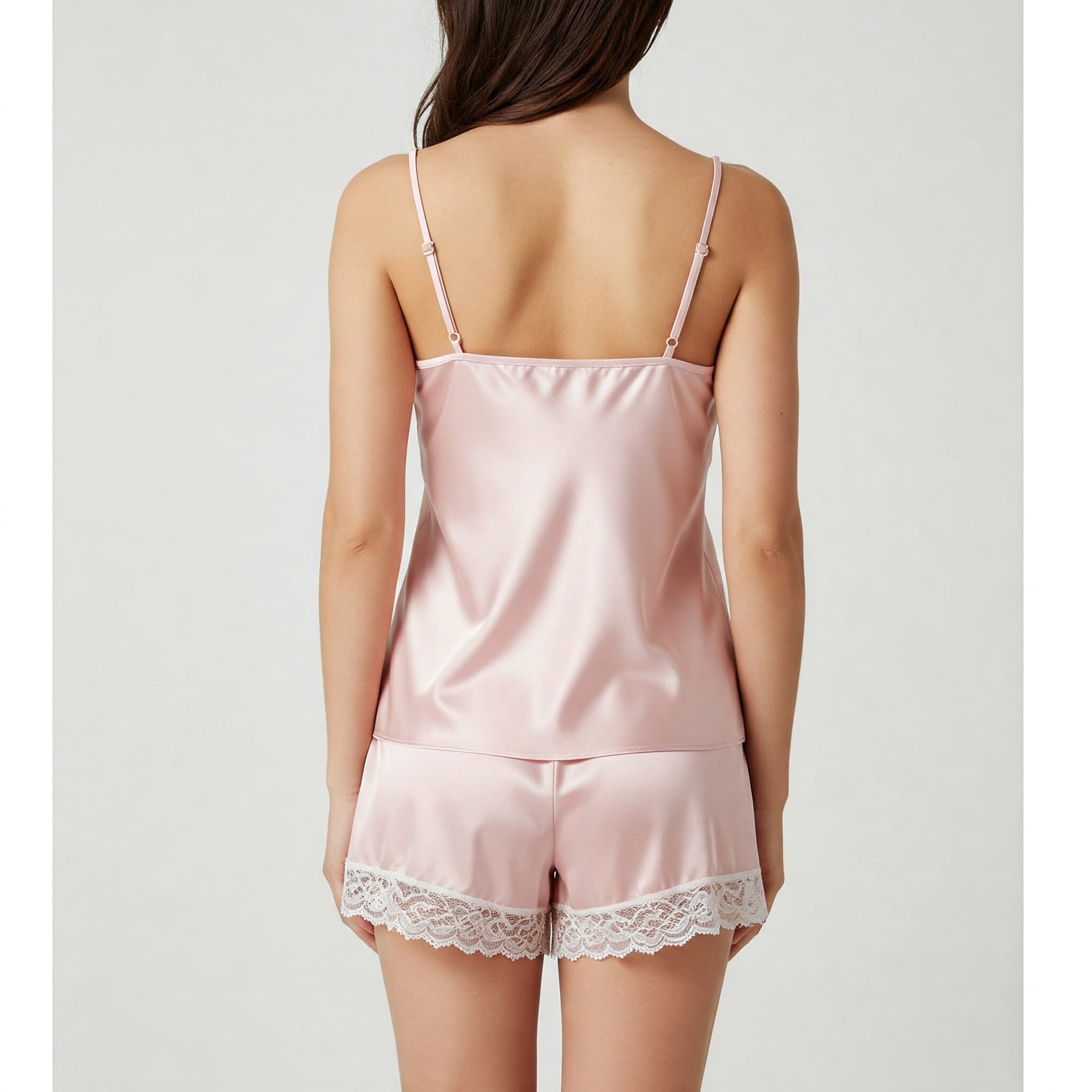 A renda Chantilly, com seus intrincados desenhos florais e delicada transparência, adiciona um toque romântico e sofisticado ao pijama. Aplicada no decote e na barra do short, a renda cria um contraste elegante com o brilho da seda, realçando a beleza da peça.