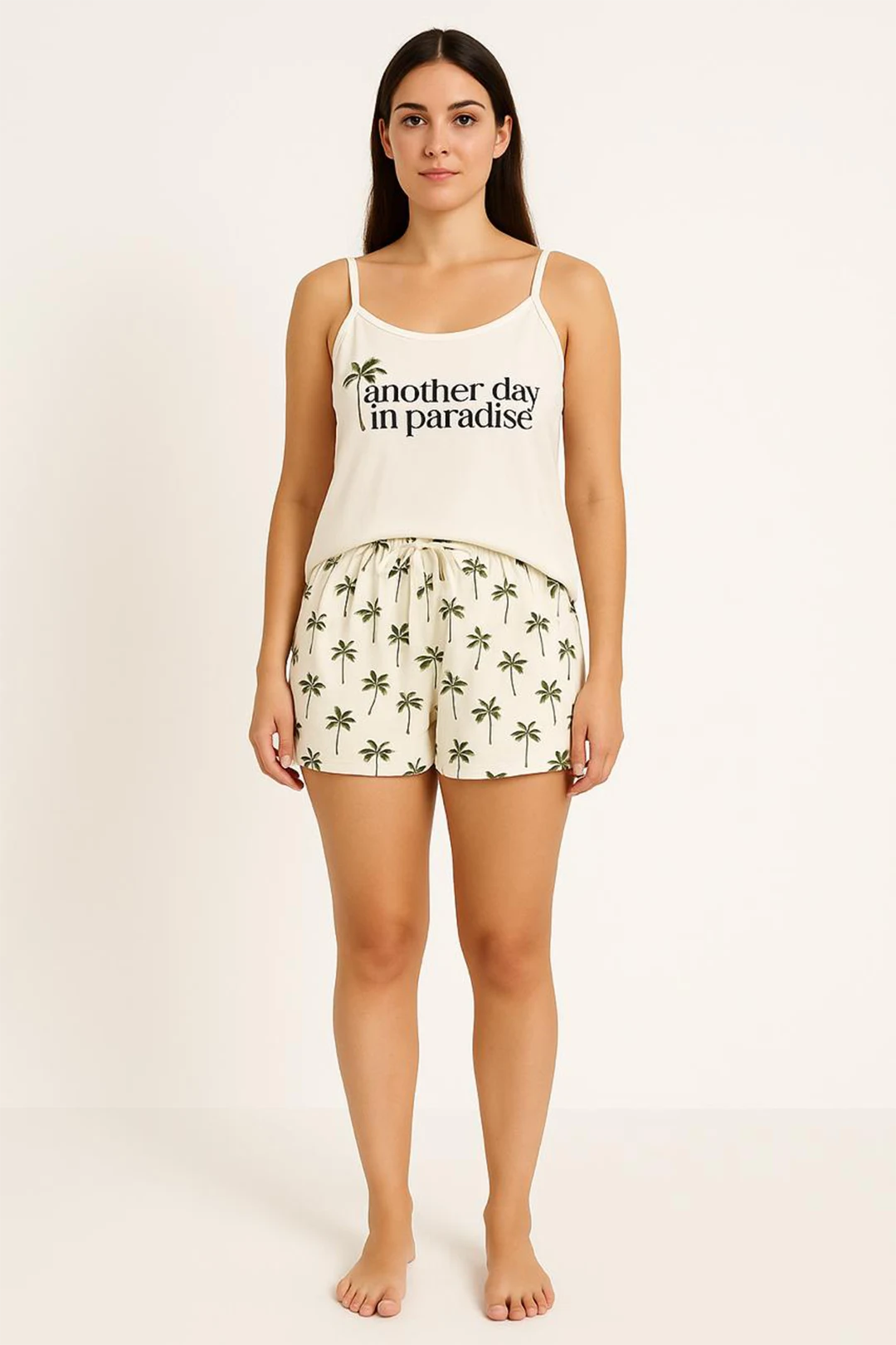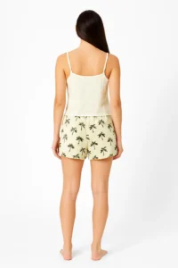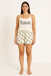 A blusinha de alça em tom off-white recebe uma estampa moderna de palmeiras. O short acompanha o mesmo estilo clean e tropical. Essa união cria um visual delicado, elegante e naturalmente acolhedor — perfeito para quem aprecia pijamas com charme e personalidade.
