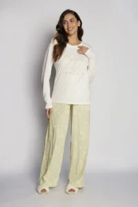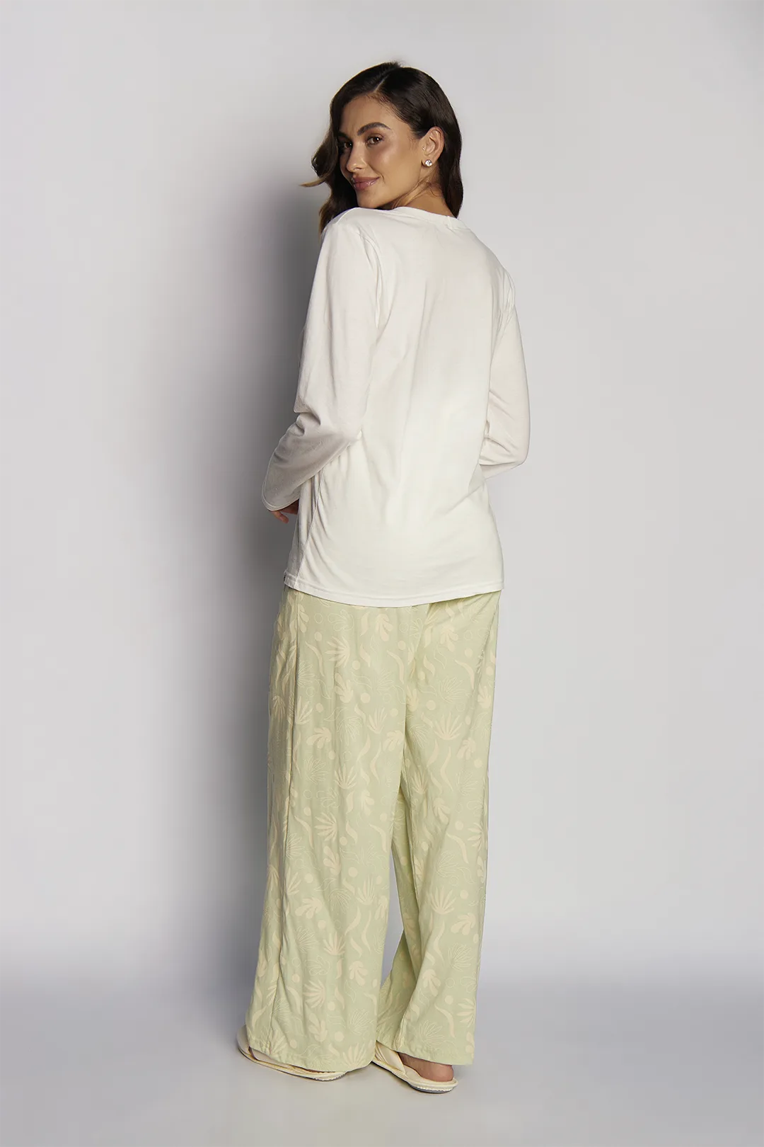 A calça, em tom verde claro suave com estampas discretas em amarelo, complementa o conjunto com harmonia. Sua modelagem mais solta e ampla nas pernas proporciona liberdade de movimento, além de um caimento fluido que reforça a sensação de conforto.