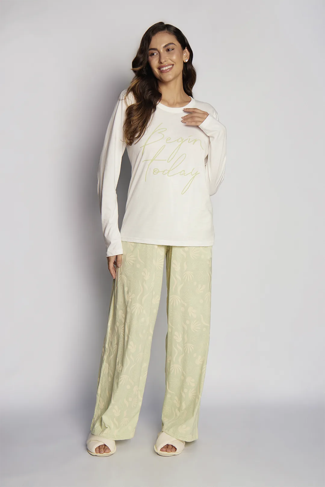 A parte superior é uma camiseta de manga longa em tom off-white, com caimento leve e barras retas, proporcionando um visual clean e confortável. O destaque fica por conta da estampa “Begin Today”, que transmite uma sensação de tranquilidade e recomeço, perfeita para acompanhar seus momentos mais calmos.