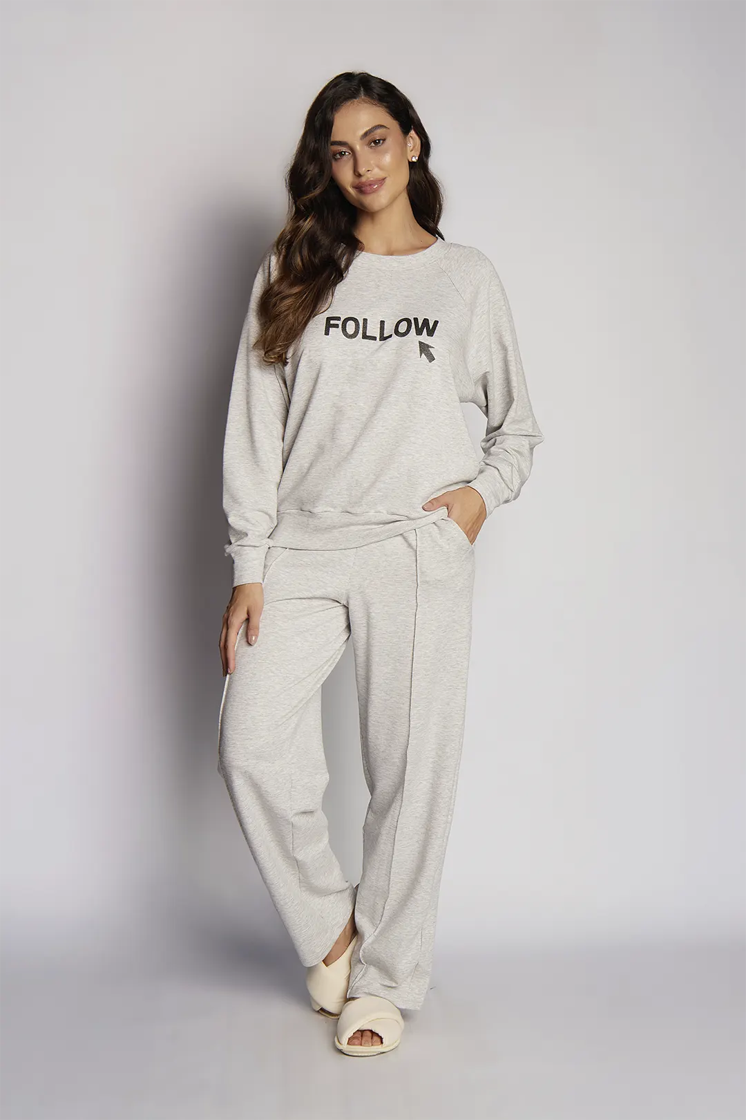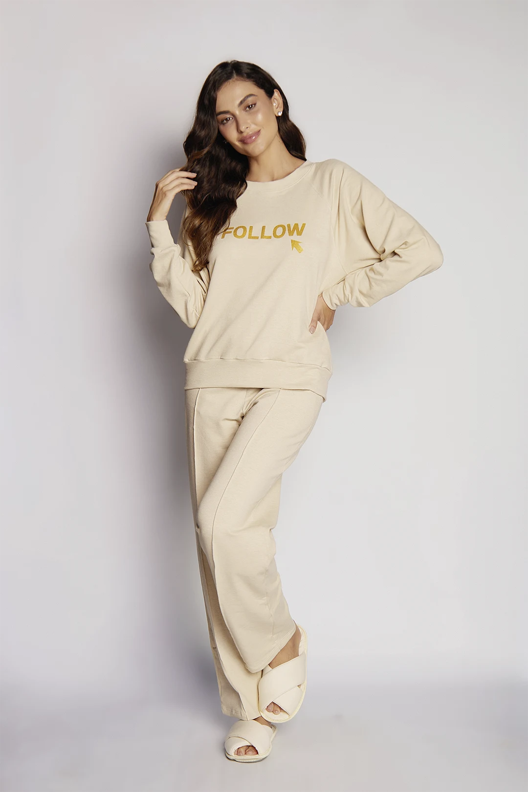 A camiseta de manga longa possui punhos e acabamento na gola e barra, garantindo um caimento confortável. A estampa “Follow” traz personalidade ao visual, aparecendo em preto na versão cinza e em dourado na versão bege, criando propostas distintas dentro do mesmo modelo.