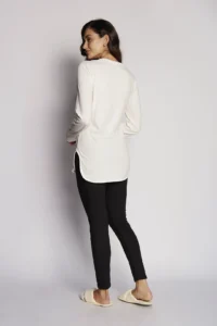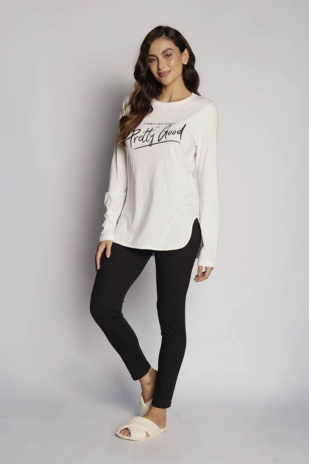 A parte superior do conjunto apresenta uma camiseta de manga longa sem punhos, garantindo que não haja compressão nos braços durante o sono. O grande destaque visual é a estampa frontal com a frase “Looks Like Today – Pretty Good”, que traz uma mensagem positiva para o seu momento de repouso. A modelagem desta peça é estrategicamente mais comprida, alcançando a altura da coxa e apresentando fendas laterais em “V”, o que proporciona um caimento fluido e evita que a peça suba ou cause desconforto ao se movimentar na cama.