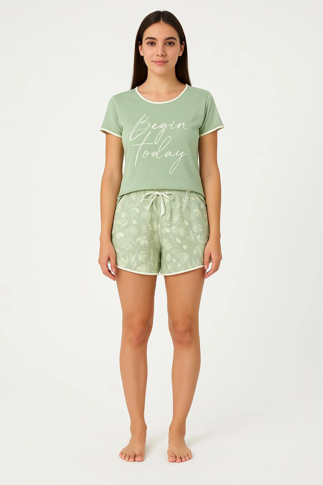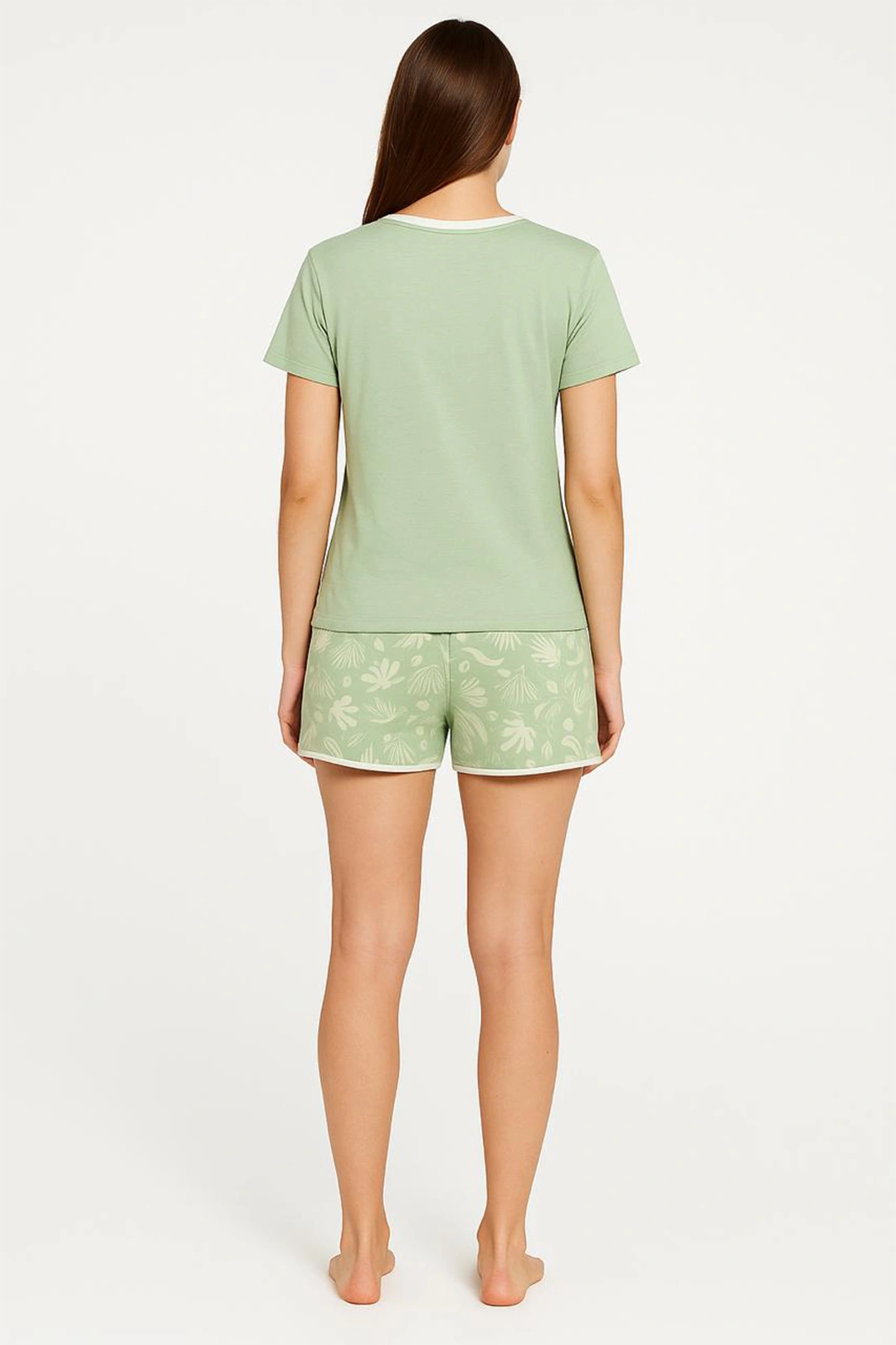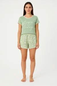 O conjunto apresenta uma blusa lisa em verde claro — um tom delicado e elegante, que transmite serenidade — combinada com shorts estampados em creme, criando um contraste moderno e sofisticado. A camisetinha leve proporciona caimento solto, confortável e arejado, enquanto o shorts com elástico ajusta-se ao corpo sem apertar, oferecendo liberdade de movimento durante toda a noite.