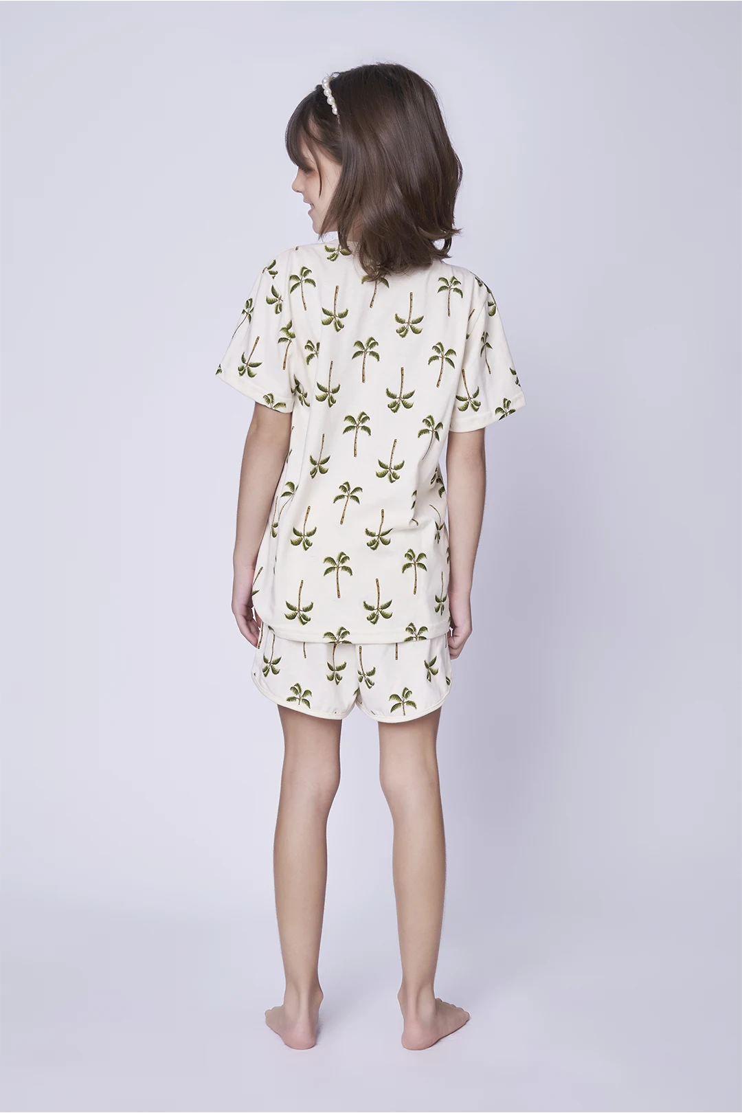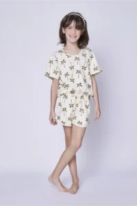 Com fundo off white e estampa suave de palmeiras, o pijama traz um ar tropical e paradisíaco. A combinação entre camiseta e short cria um visual moderno, alegre e perfeito para meninas que adoram um toque de charme leve e descontraído.