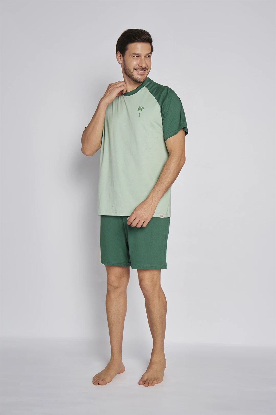 Verde claro na camiseta, com mangas verde folha e short verde folha